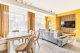 część jadalna, stół, 6x krzesła, aneks kuchenny - płyta elektryczna 4x palnik, zmywarka, mikrofalówka, czajnik elektryczny, lodówko-zamrażarka, garnki, naczynia, sztućce, szkło
