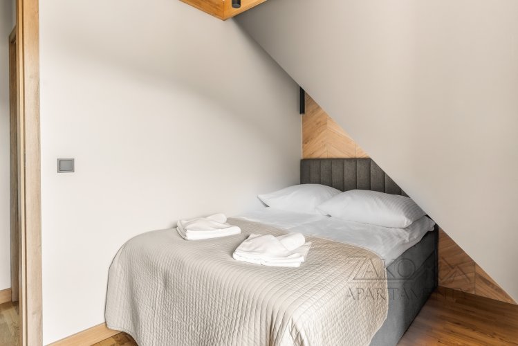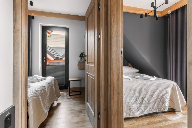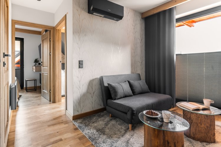 Wnętrze utrzymane jest w ciepłym, górskim stylu – dominują naturalne drewniane elementy, stonowana kolorystyka oraz subtelne nawiązania do tatrzańskiej przyrody. Starannie dobrane detale tworzą przytulną, harmonijną przestrzeń sprzyjającą wypoczynkowi po dniu spędzonym na górskich szlakach.