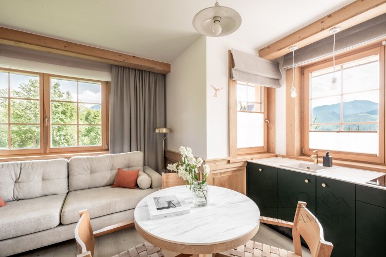 Salon, kuchnia, sypialnia, łazienka, wyjście na TARAS wspólny z Apartamentami na piętrze. WIDOK na GÓRY.