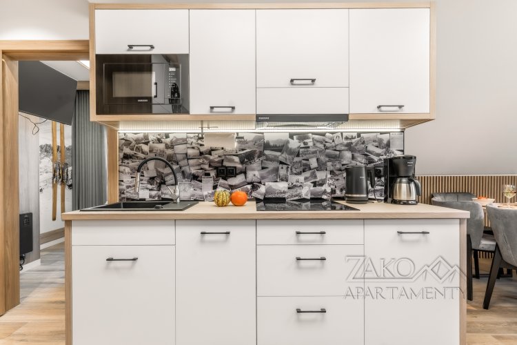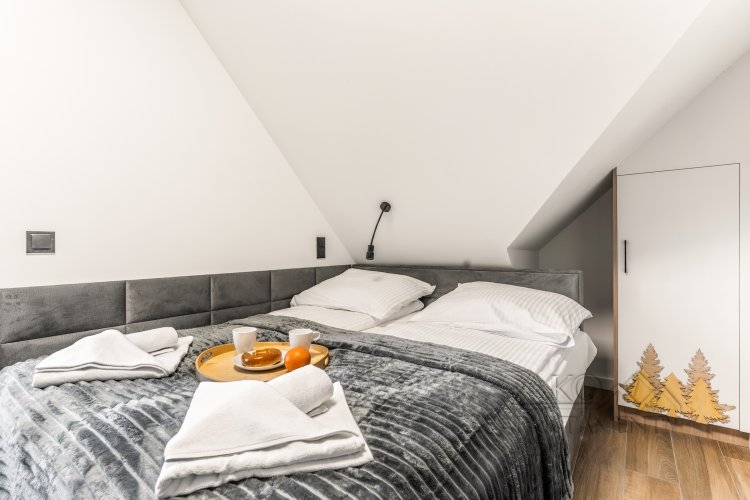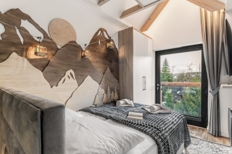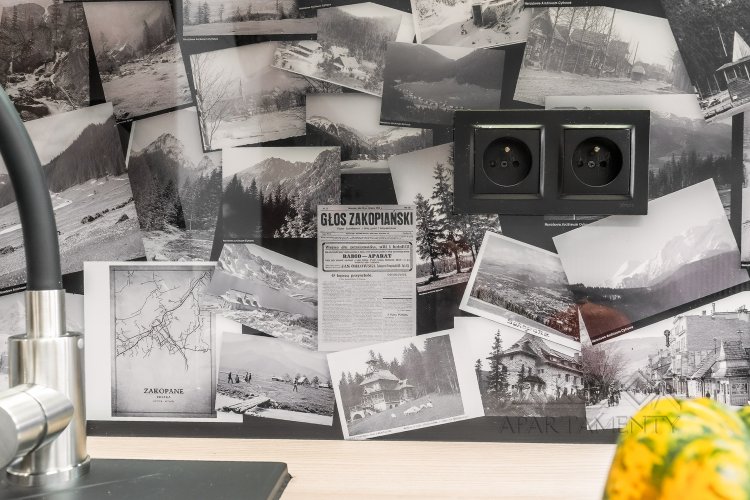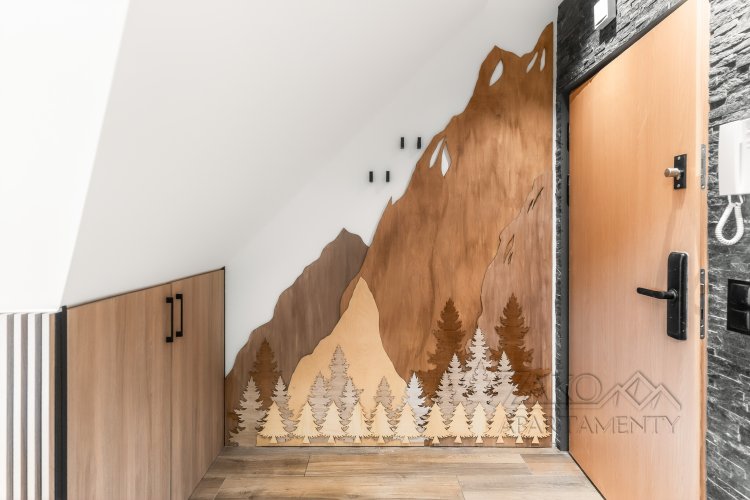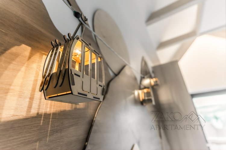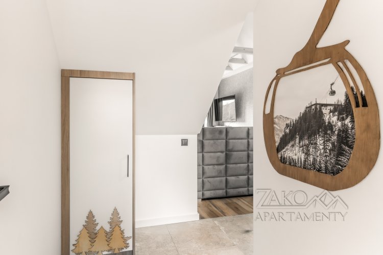 Wystrój wnętrza nawiązuje do klimatu gór – wszechobecne motywy choinek, drewniane elementy przedstawiające kolejkę na Kasprowy Wierch oraz zabytkowe narty w jednej z sypialni tworzą oryginalną i przytulną atmosferę. Starannie dobrane dekoracje nadają apartamentowi wyjątkowy, charakterystyczny styl.