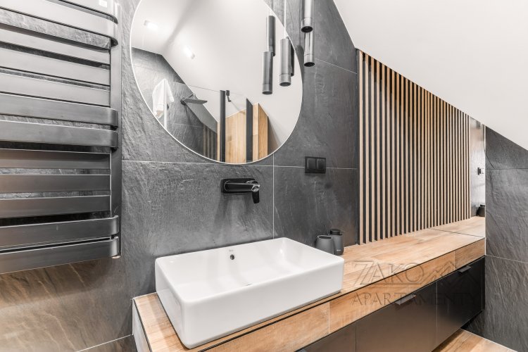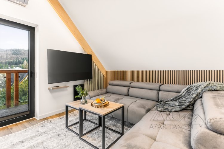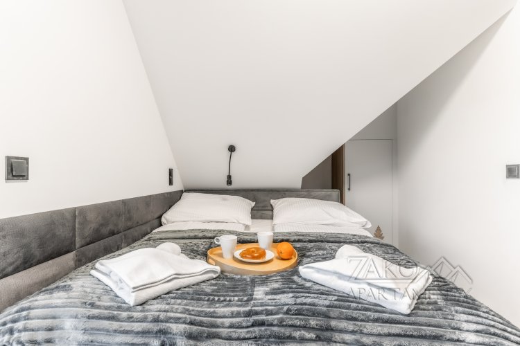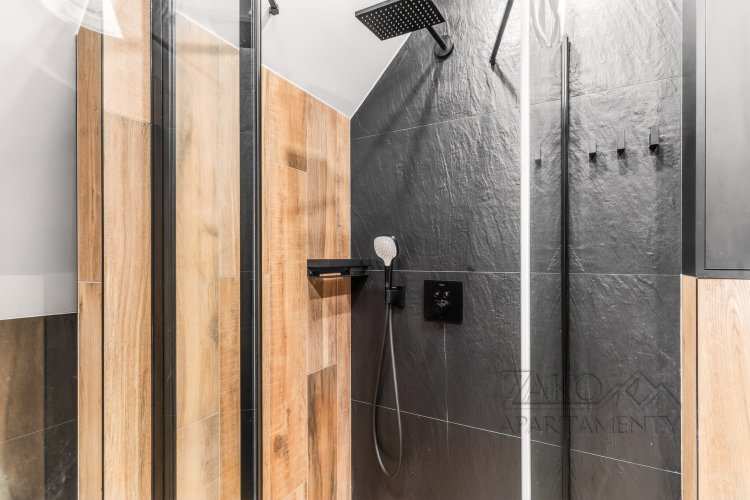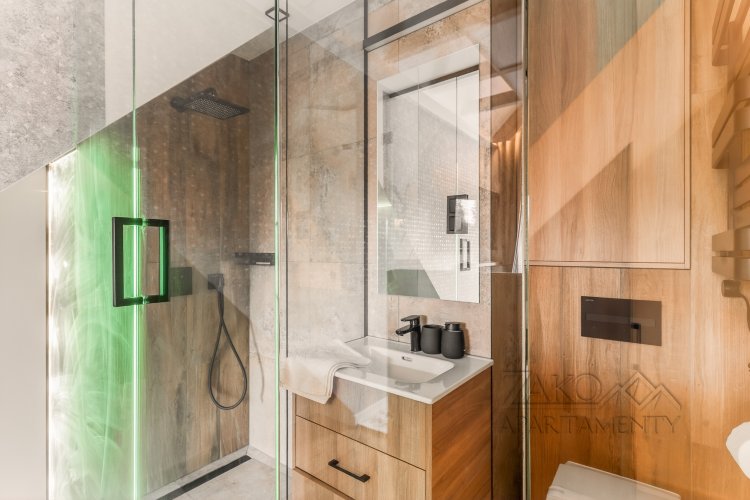 Apartament oferuje dwie łazienki, w tym jedną przeszkloną, bezpośrednio w sypialni, co podkreśla jego luksusowy charakter. Dodatkowe udogodnienia to klimatyzacja oraz wyjście z salonu na balkon z pięknym widokiem na Giewont.