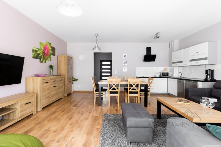 sofa rozkładana (140cm/200cm), TV. 42", komoda, pościel, wyjście na ogród.