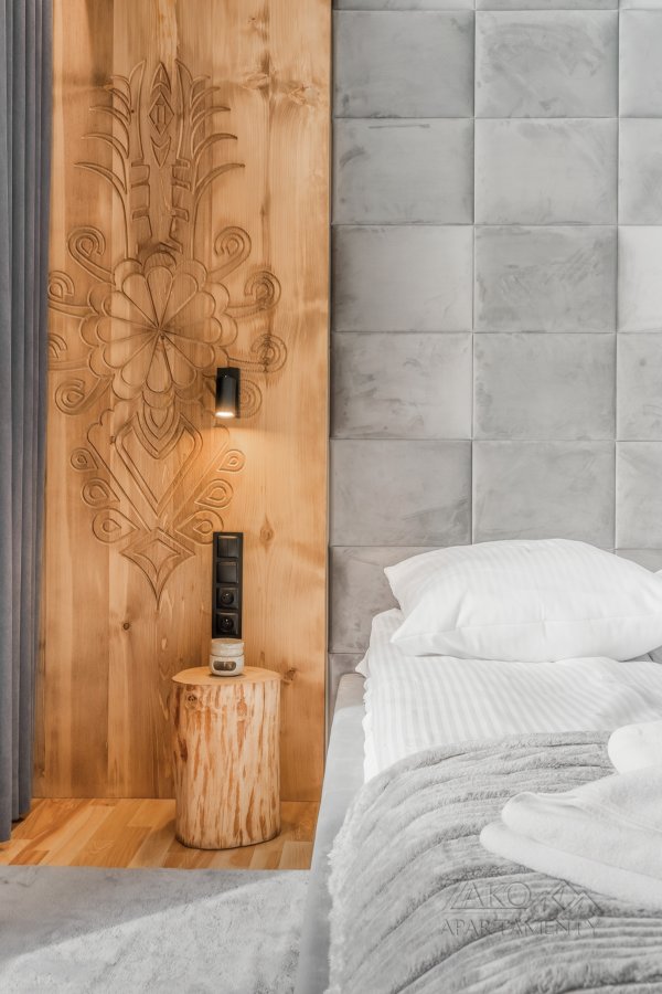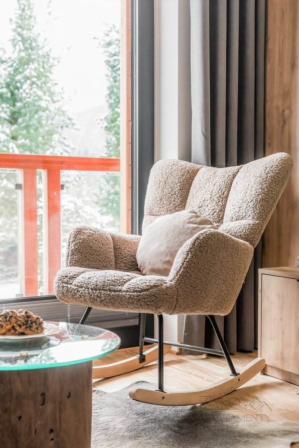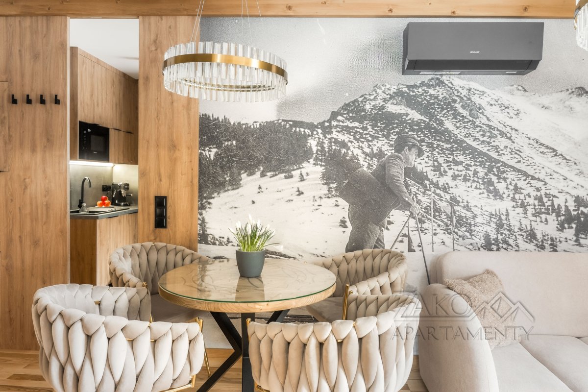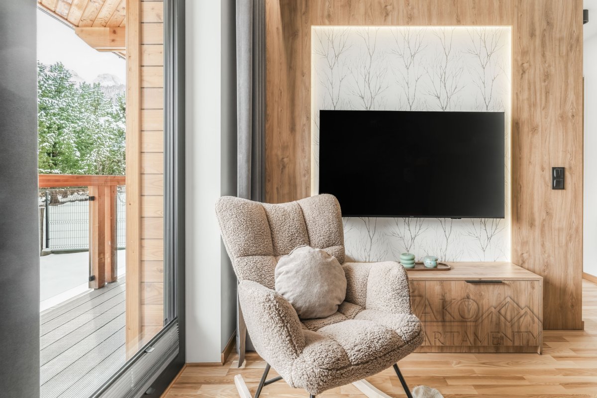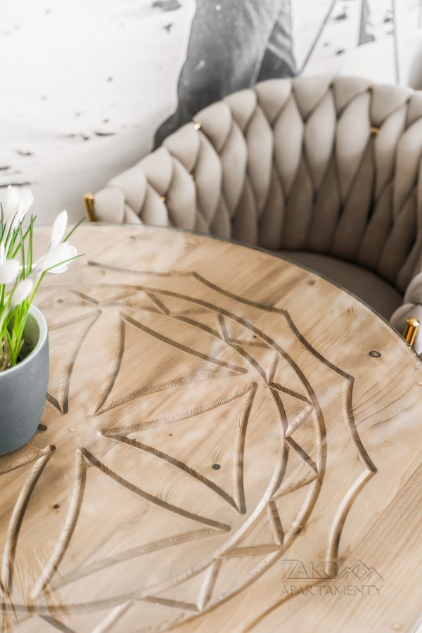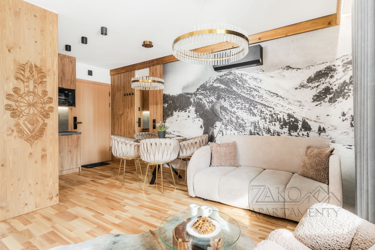 Wnętrze apartamentu zachwyca stylem inspirowanym Podhalem. Dominuje tu naturalne drewno, które nadaje przestrzeni ciepła i autentycznego, górskiego klimatu. Rzeźbione parzenice oraz subtelne regionalne akcenty podkreślają lokalny charakter aranżacji. Salon zdobi stylowa, czarno-biała fototapeta przedstawiająca górski krajobraz oraz postać Kuriera Tatrzańskiego, która nadaje wnętrzu wyjątkowej tożsamości i nawiązuje do historii regionu. Całość tworzy harmonijną, stylową, ciepłą i przytulną przestrzeń sprzyjającą wypoczynkowi.