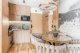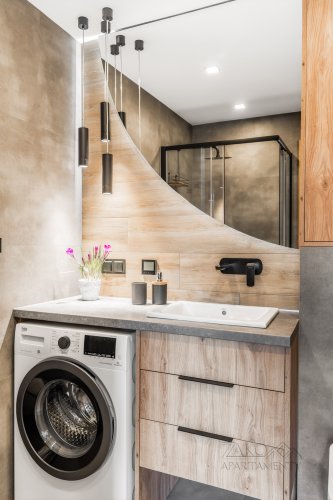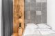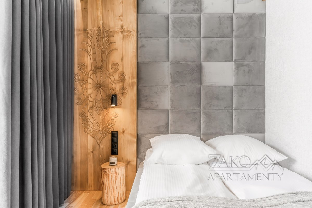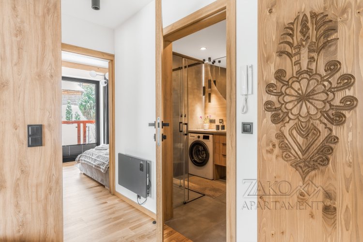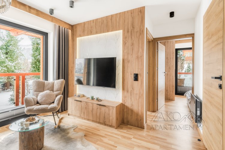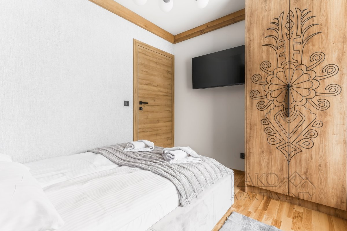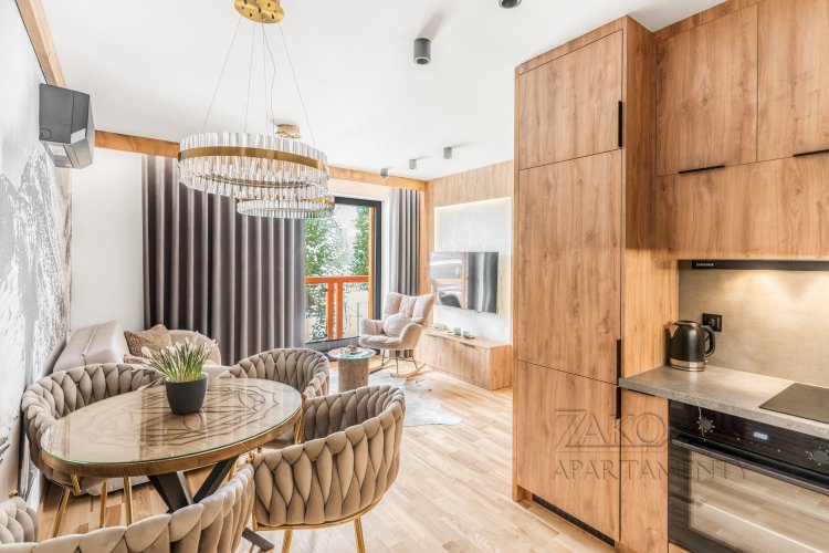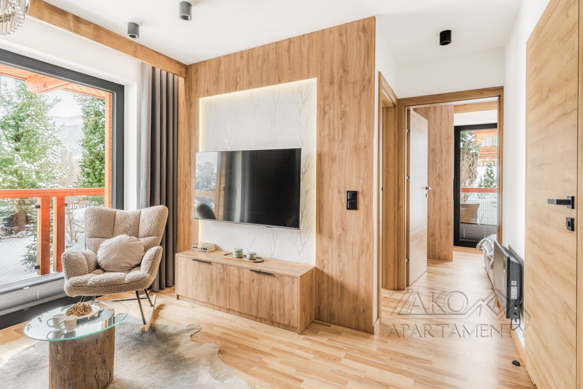 Wnętrze apartamentu zachwyca stylem inspirowanym Podhalem. Dominuje tu naturalne drewno, które nadaje przestrzeni ciepła i autentycznego, górskiego klimatu. Rzeźbione parzenice oraz subtelne regionalne akcenty podkreślają lokalny charakter aranżacji. Salon zdobi stylowa, czarno-biała fototapeta przedstawiająca górski krajobraz oraz postać Kuriera Tatrzańskiego, która nadaje wnętrzu wyjątkowej tożsamości i nawiązuje do historii regionu. Całość tworzy harmonijną, stylową, ciepłą i przytulną przestrzeń sprzyjającą wypoczynkowi.