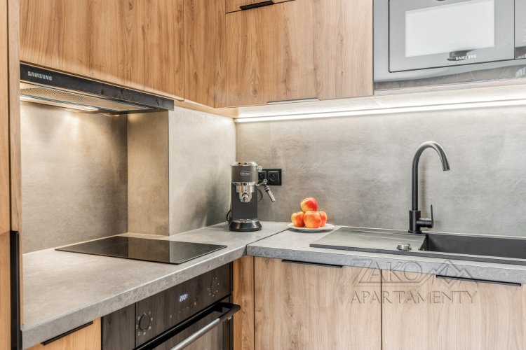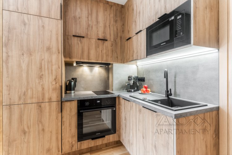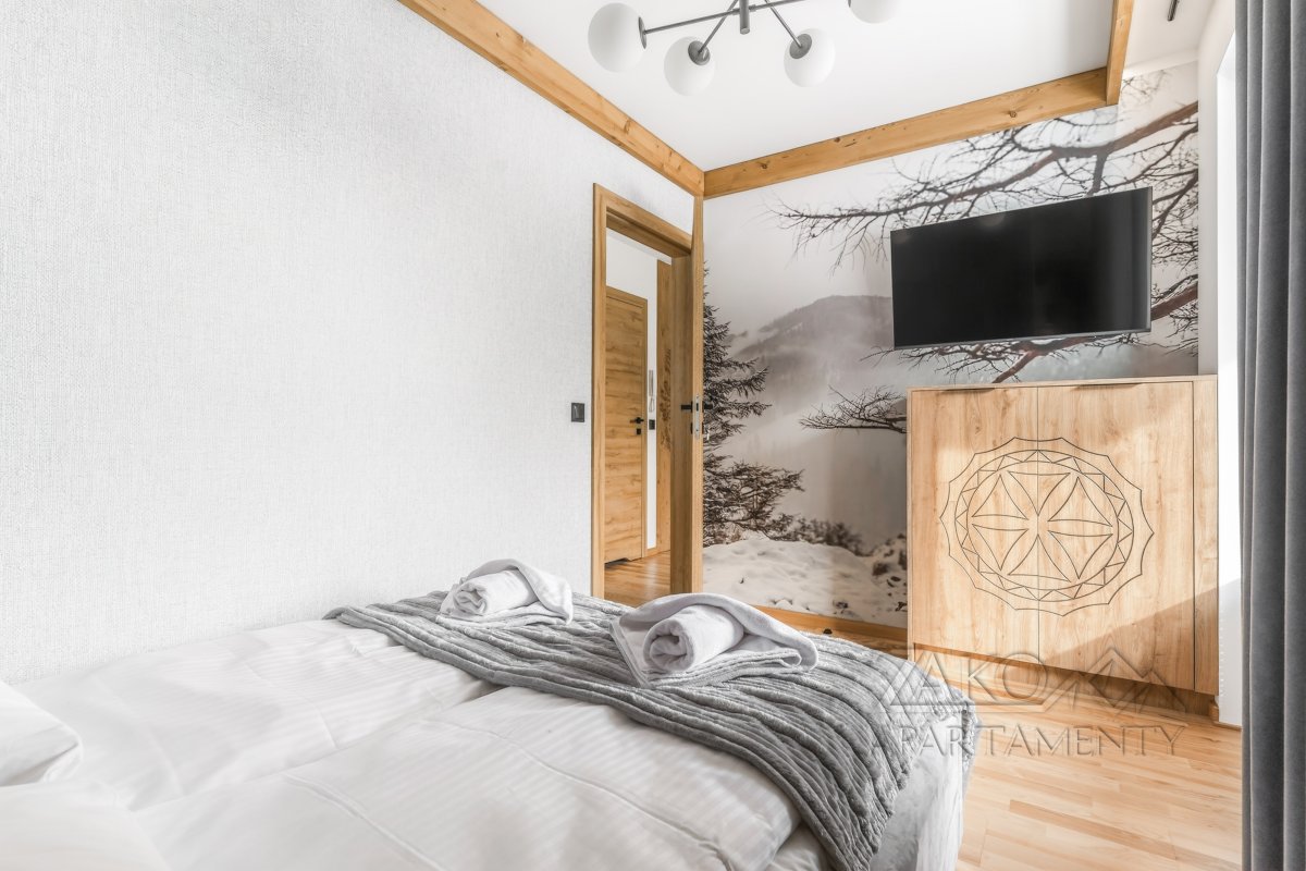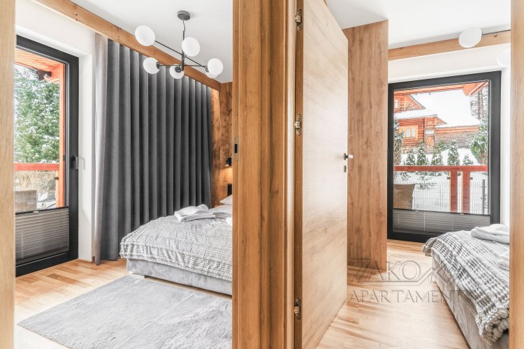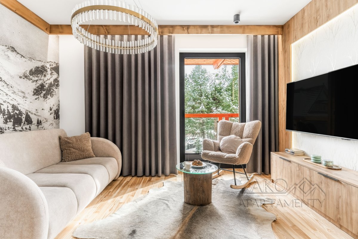 Do dyspozycji Gości pozostaje przestronny salon z wygodną strefą relaksu i wyjściem na balkon, w pełni wyposażony aneks kuchenny oraz komfortowe sypialnie zapewniające spokojny, regenerujący sen. Apartament został zaprojektowany z myślą o funkcjonalności i wygodzie, przy jednoczesnym zachowaniu eleganckiego, górskiego charakteru.