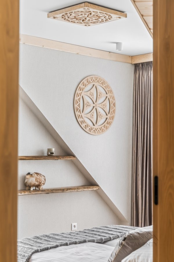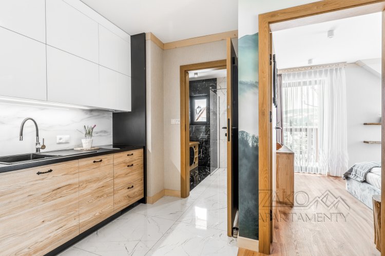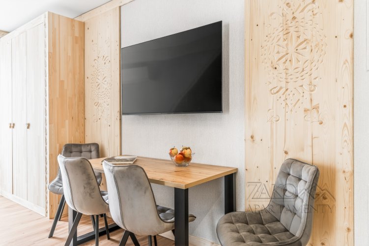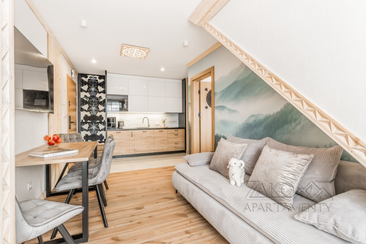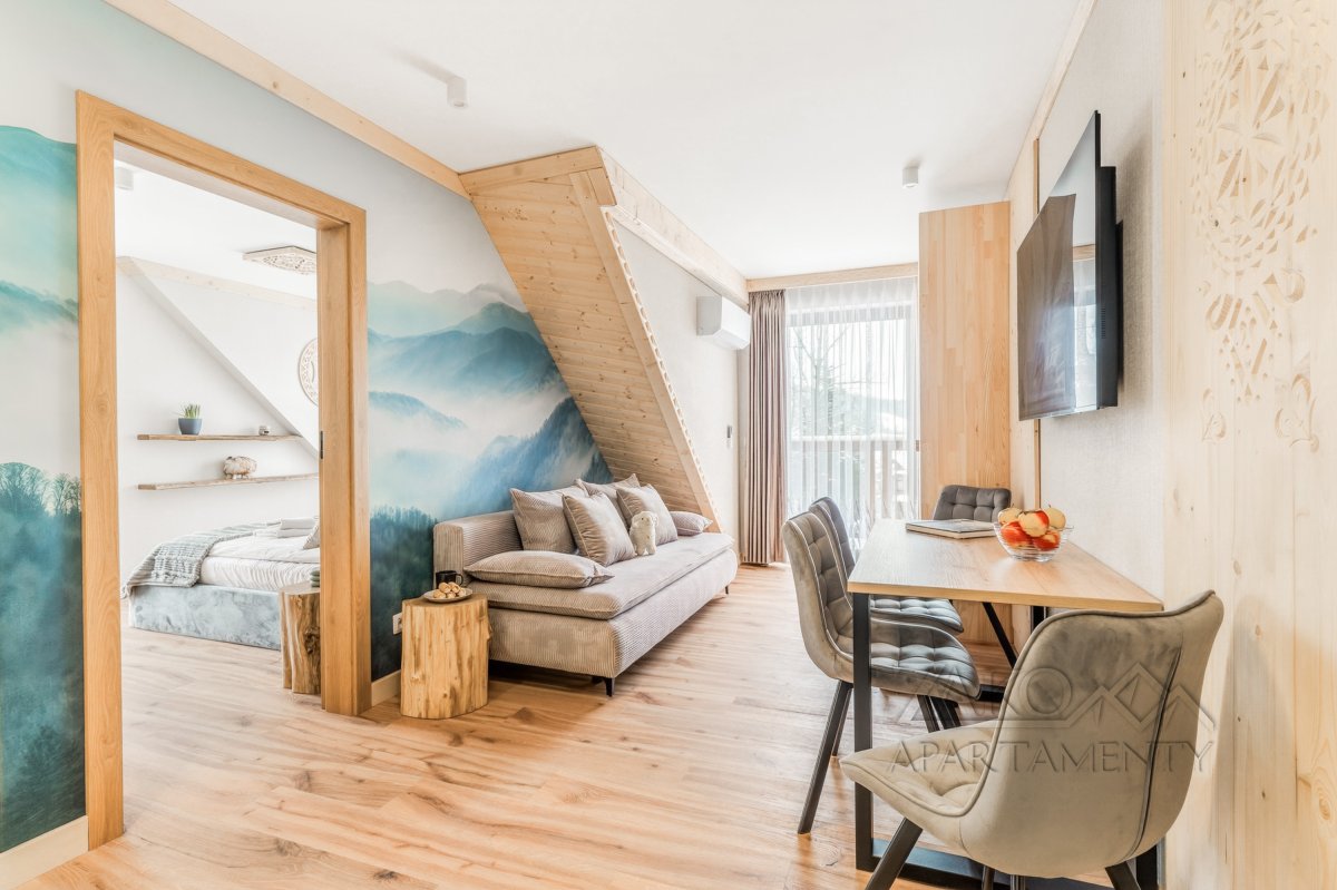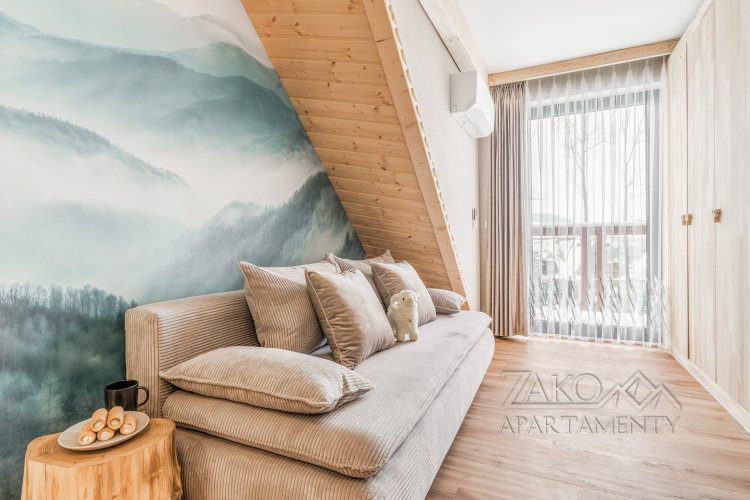 To komfortowy, 4-osobowy apartament urządzony w stylu nowoczesnym góralskim - z eleganckimi elementami drewna i przytulnymi akcentami inspirowanymi naturą. W przestronnym salonie uwagę przyciąga wyjątkowa tapeta przedstawiająca las i delikatnie zamglone góry - tworzy ona nastrojowe tło do porannej kawy i wieczornego relaksu. Sypialnia jest jasna i przytulna, a jej charakter podkreśla piękny, podświetlany obraz z motywem górskiego lasu. Z sypialni można wyjść bezpośrednio na balkon - idealne miejsce, by złapać oddech i nacieszyć się ciszą.