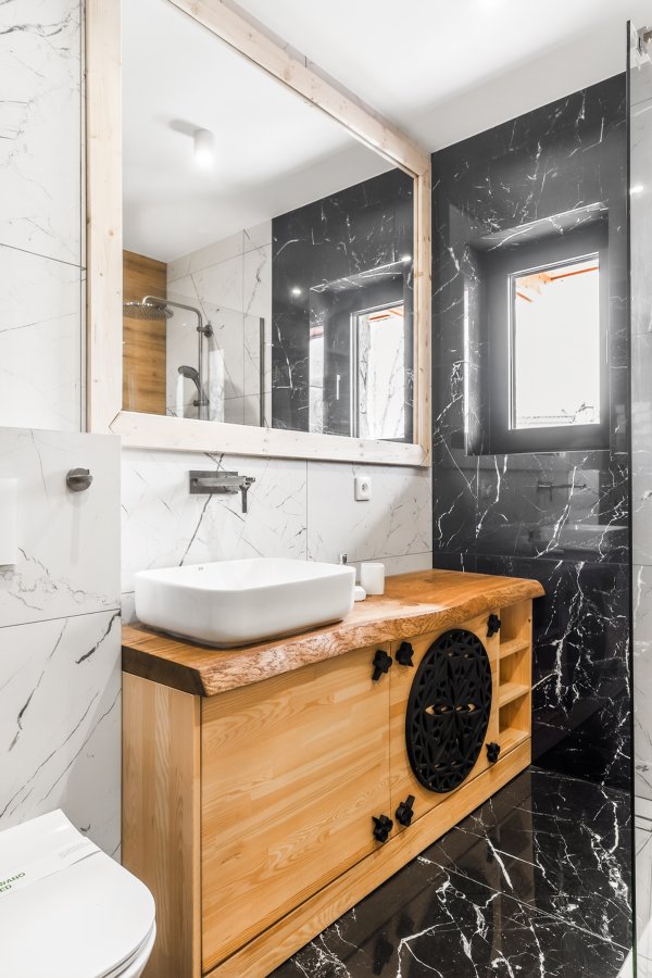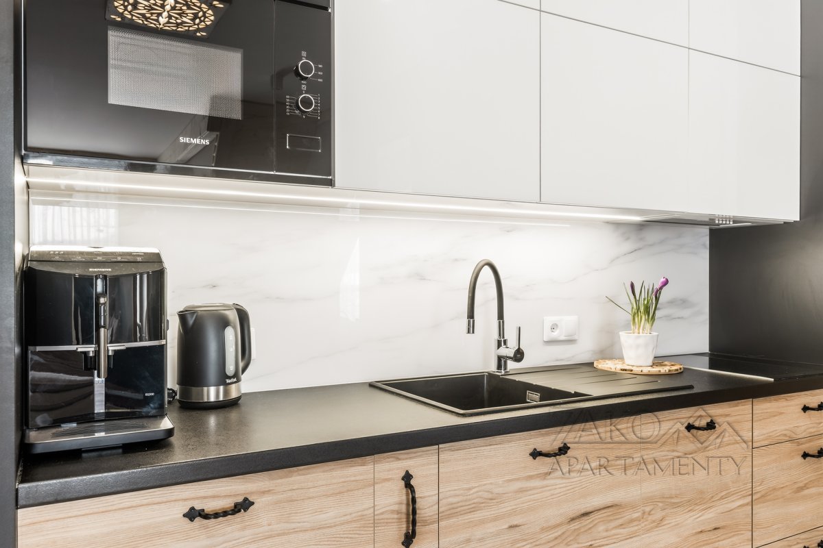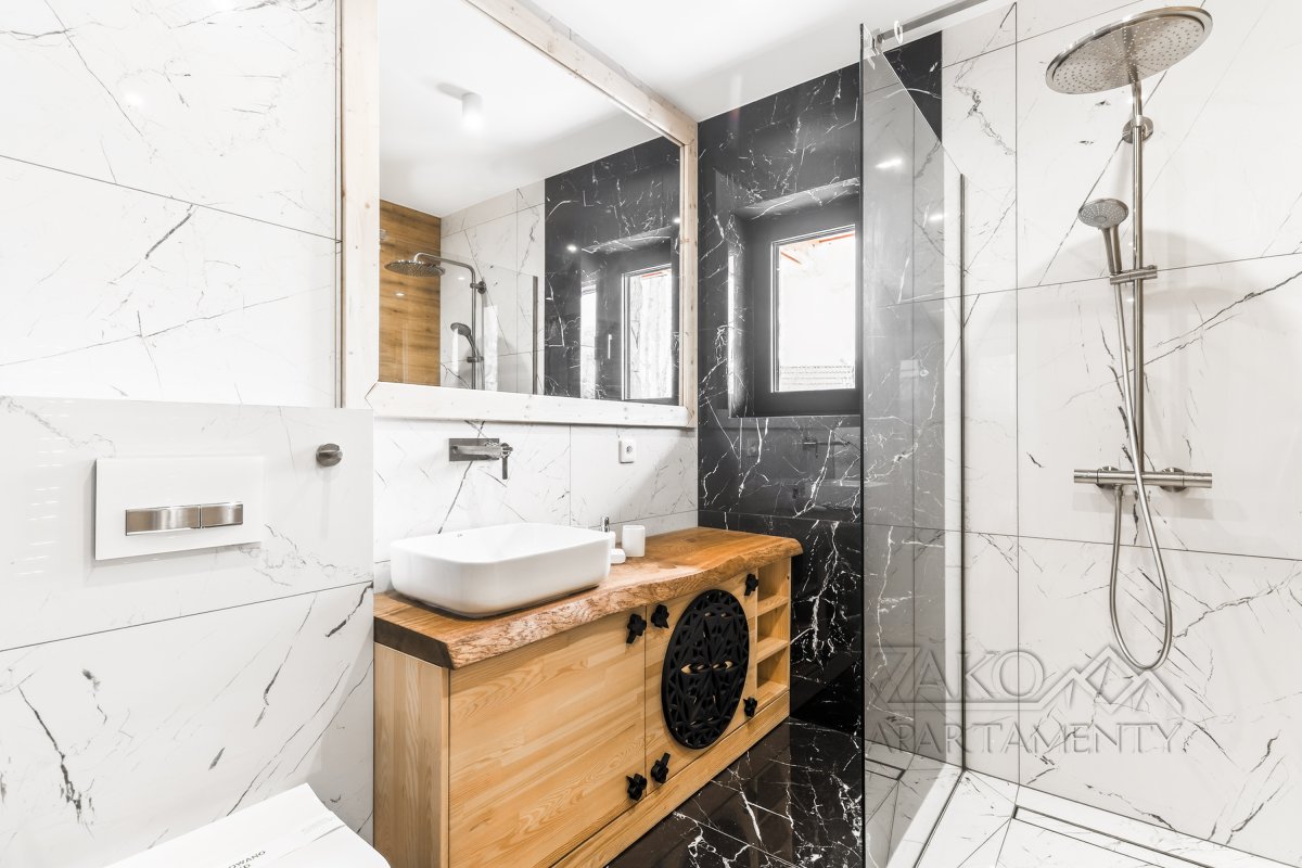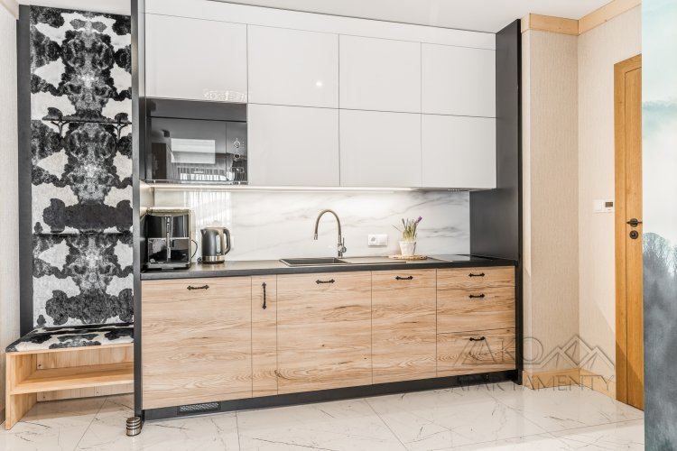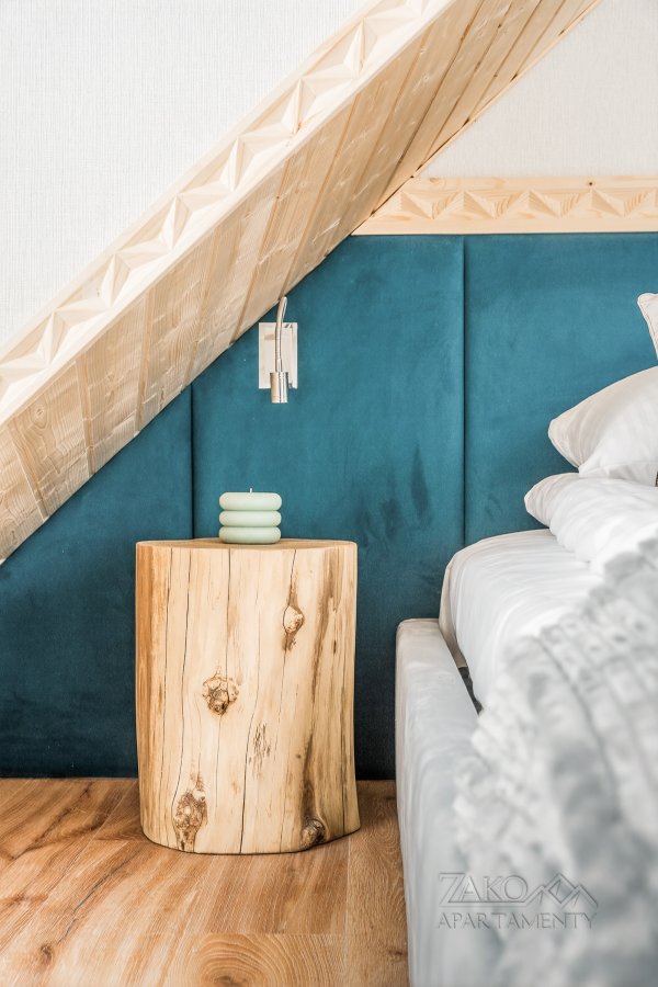 To komfortowy, 4-osobowy apartament urządzony w stylu nowoczesnym góralskim - z eleganckimi elementami drewna i przytulnymi akcentami inspirowanymi naturą. W przestronnym salonie uwagę przyciąga wyjątkowa tapeta przedstawiająca las i delikatnie zamglone góry - tworzy ona nastrojowe tło do porannej kawy i wieczornego relaksu. Sypialnia jest jasna i przytulna, a jej charakter podkreśla piękny, podświetlany obraz z motywem górskiego lasu. Z sypialni można wyjść bezpośrednio na balkon - idealne miejsce, by złapać oddech i nacieszyć się ciszą.