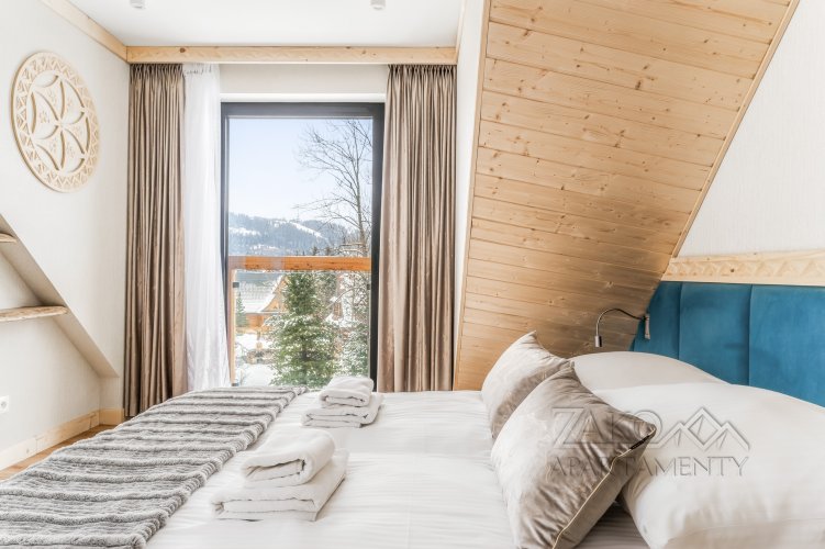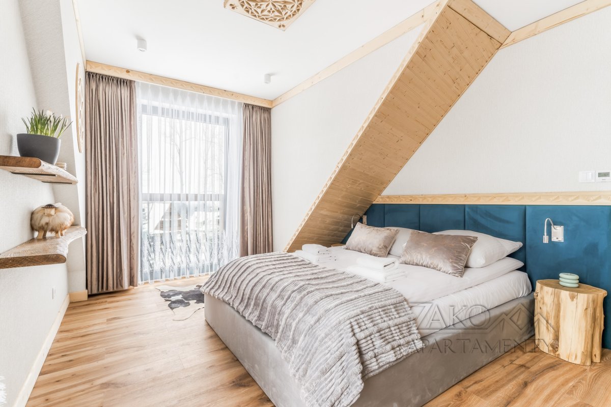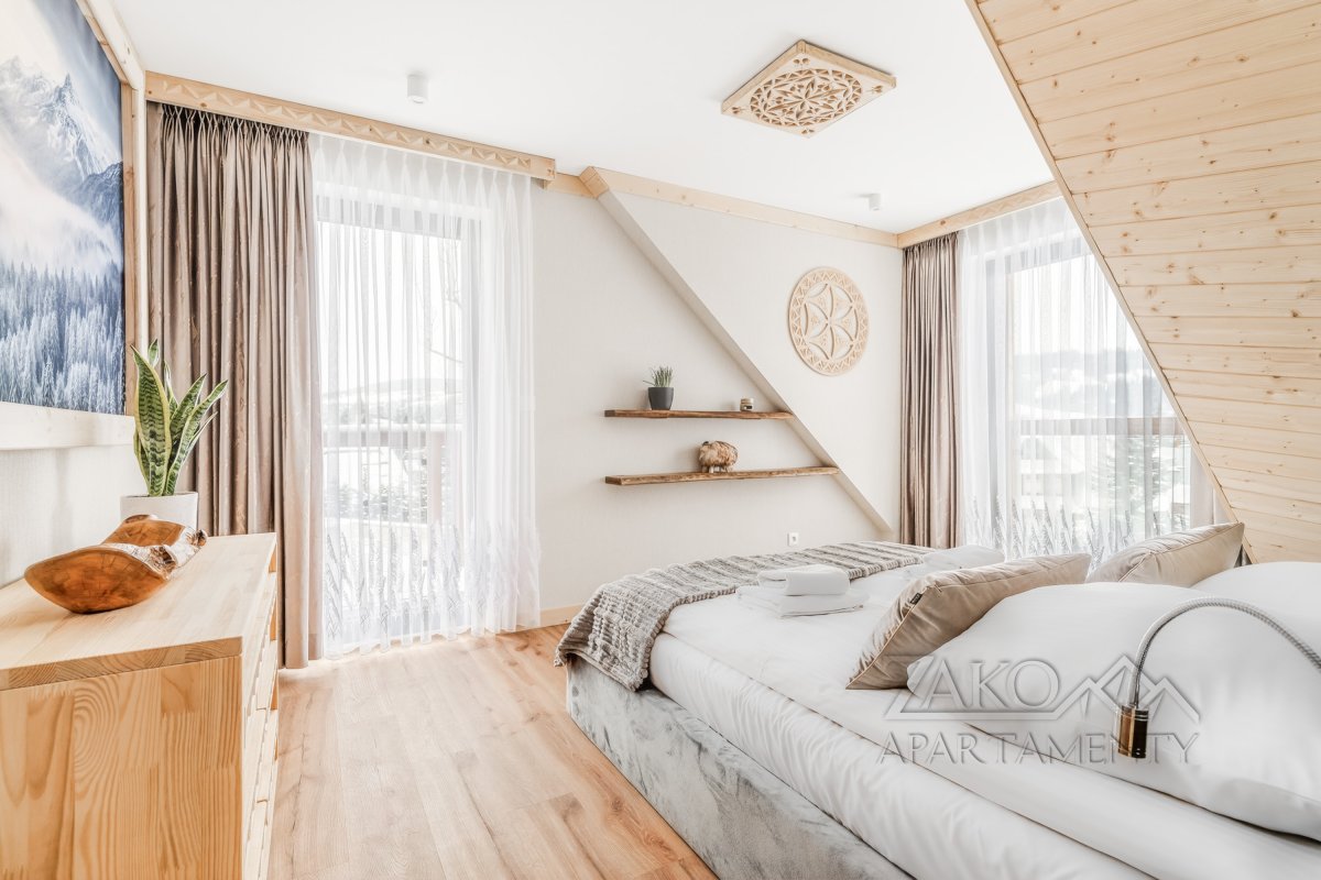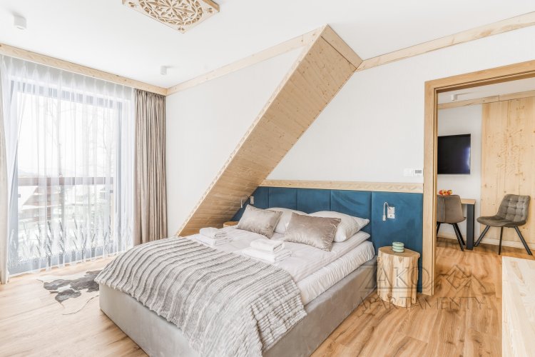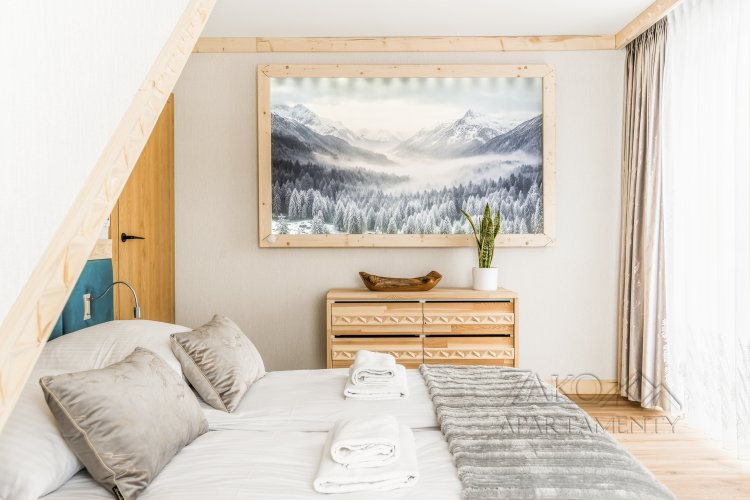 Łoże małżeńskie (160cm/200cm) komoda, obraz podświetlany, 2x stolik nocny, półki, pościel, wyjscie na balkon oraz balkon francuski z widokiem na Butorowy Wierch.