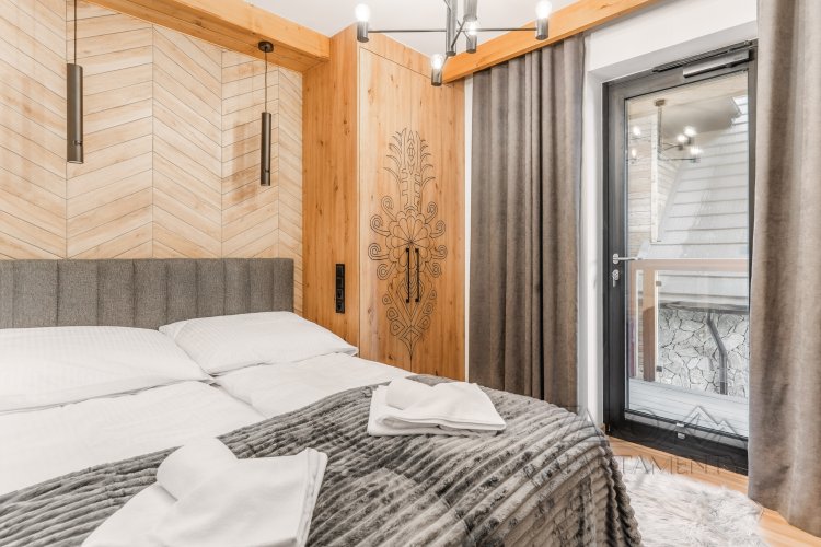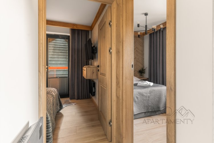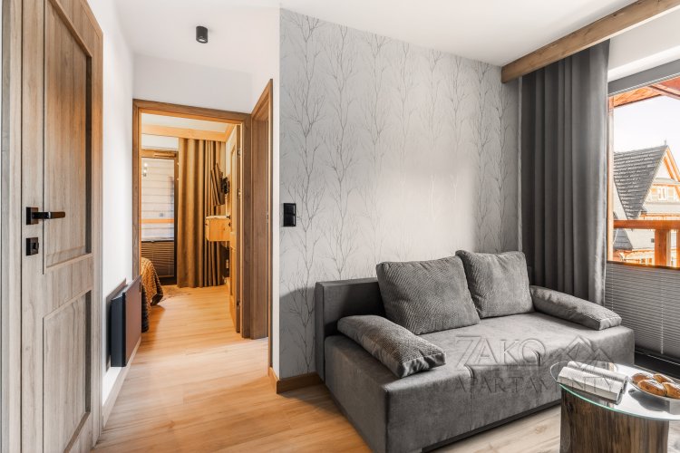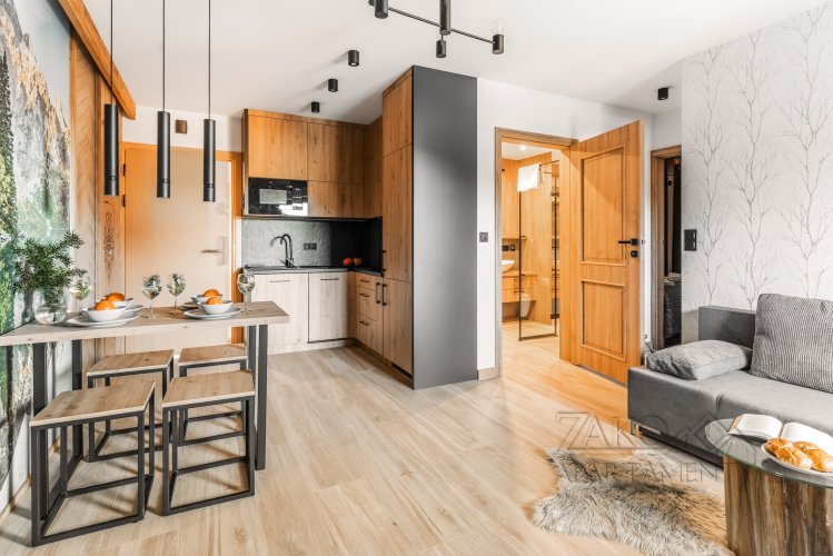 Apartament oferuje wygodną strefę wypoczynkową z salonem, wyjście z salonu na balkon z pięknym widokiem na Giewont, w pełni wyposażony aneks kuchenny oraz komfortową sypialnię, zapewniającą spokojny sen. Całość zaprojektowana została z myślą o funkcjonalności i wygodzie, bez rezygnacji z estetyki i klimatu regionu.