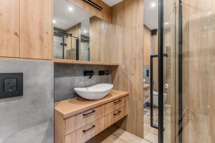 Wnętrze apartamentu utrzymane jest w ciepłym, góralskim stylu – dominują naturalne drewniane elementy, jasne kolory oraz subtelne nawiązania do tradycji górskiej. Starannie dobrane detale tworzą przytulną, domową przestrzeń, sprzyjającą odpoczynkowi po aktywnym dniu w górach