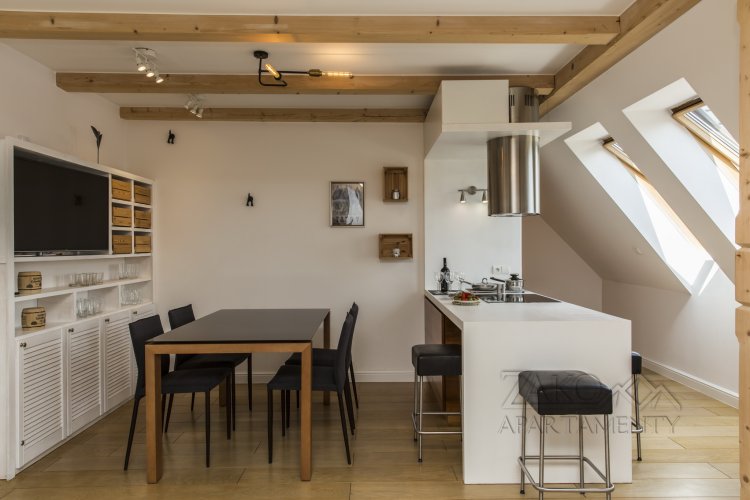 Apartament jest dwupoziomowy co daje komfort wypoczynku rodzinie z dziećmi lub grupie zaprzyjaźnionych osób. W każdej chwili można oderwać się od pozostałych mieszkańców i zrelaksować się np. w sypialni na piętrze. Wieczory w salonie można spędzić przy swietle KOMINKA, który umili wspólnie spedzany czas.