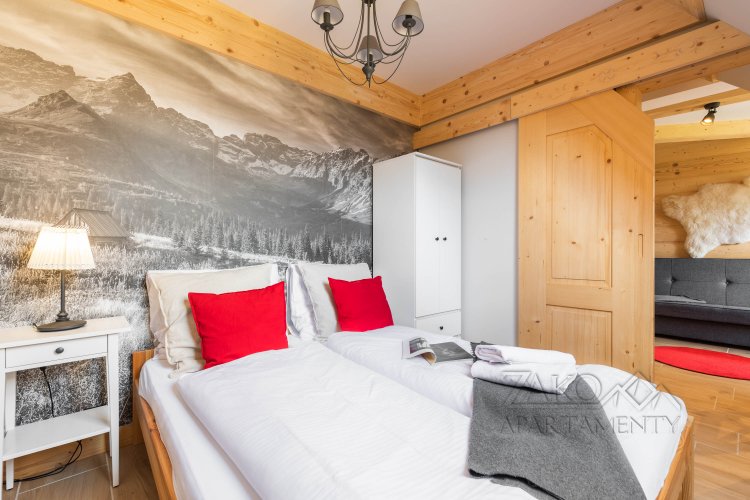 Apartament ZOBACZ GIEWONT Lux 07 to wyjątkowe wnętrze składające się z sypialni, salonu z aneksem kuchennym, łazienki oraz BALKONU. Wnętrze tego apartamentu jest utrzymane w stylistyce podhalańskiej, jednocześnie bardzo wygodne i funkcjonalne. Drewniane ściany stwarzają atmosferę zakopiańską wtopioną w nowoczesna stylistykę. Czarno-białe fototapety przedstawiające Tatry nadają niepowtarzalny klimat otaczających gór. Goście będą mieli okazję poznać koloryt podhalańskiego regionu.