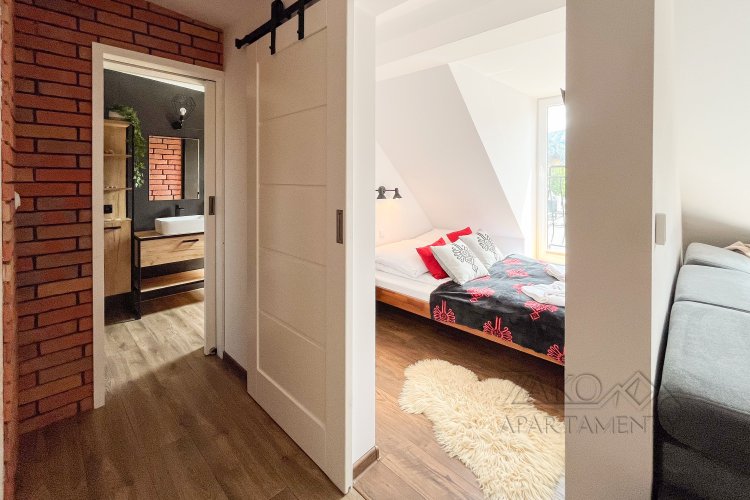 W skład apartamentu wchodzi salon z wyjściem na BALKON z WIDOKIEM NA GÓRY, aneks kuchenny, dwie sypialnie, jedna z wyjściem na balkon i łazienka.